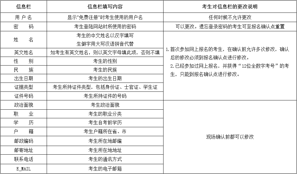 1. “免费注册”是为了让考生获得网上报名的登录用户名和密码。用户名和密码是使用网上报名系统的唯一依据,需要长期使用,考生必须牢记。